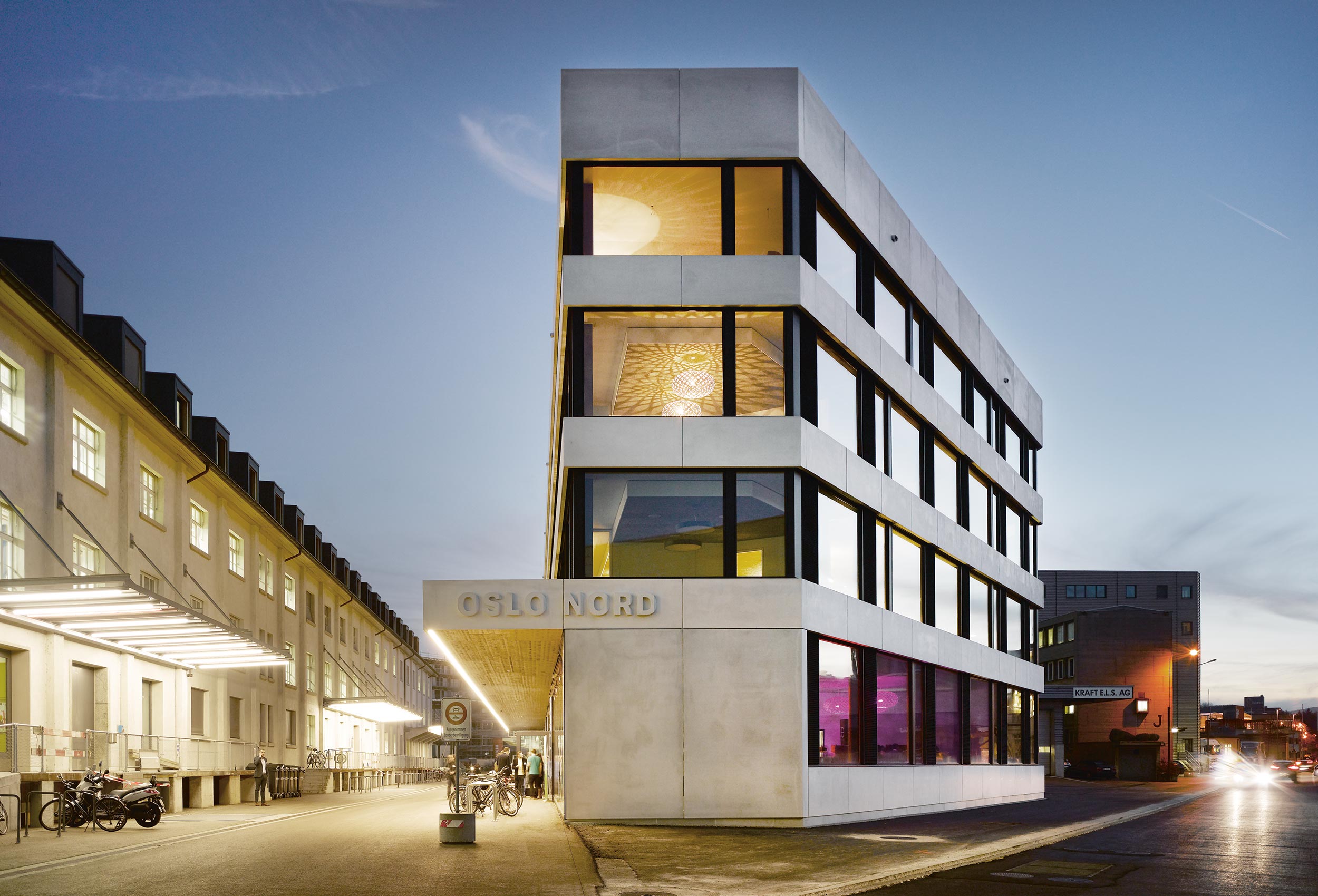 Zwischen Schrotthändler und Lagerhäusern gelegen, ist OSLO NORD eines der ersten Gebäude mit Wohnungen auf dem Dreispitzareal (Basel-Münchenstein). Wenn man von der Stadt her zum Campus der Künste kommt, bildet der Büro- und Wohnungsbau das Eingangstor zum Kunstfreilager. Mit einer Fassade aus Faserzementplatten fügt sich dieser unspektakulär in das vielschichtige Quartier ein. Die dreidimensionale Fassadenschrift adaptiert die spitze Gebäudeform und ist aus dem selben Material wie die Fassade. Um die statische Belastung möglichst gering zu halten, wurden die Buchstaben zu Hohlkörpern gegossen.